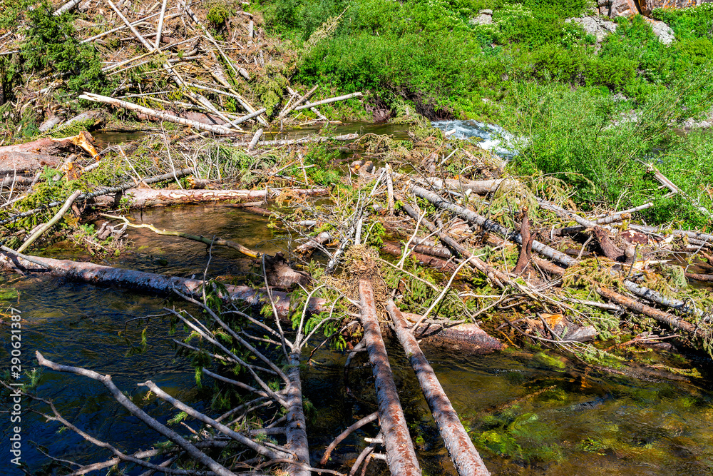 Log fallen tree crossing on pond stream lake at Snowmass creek on hiking trail in Colorado in July summer