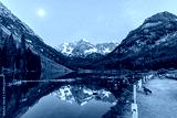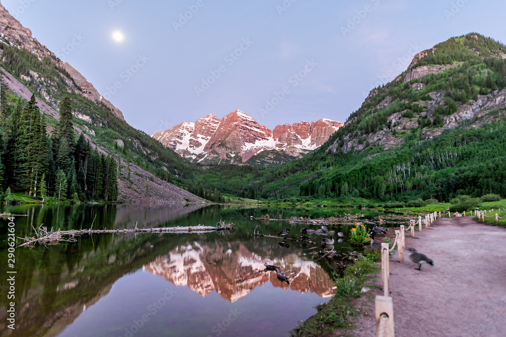 Maroon Bells lake before sunrise in Aspen, Colorado at blue hour dawn with rocky mountain peak and snow in July 2019 summer and mirror moon reflection