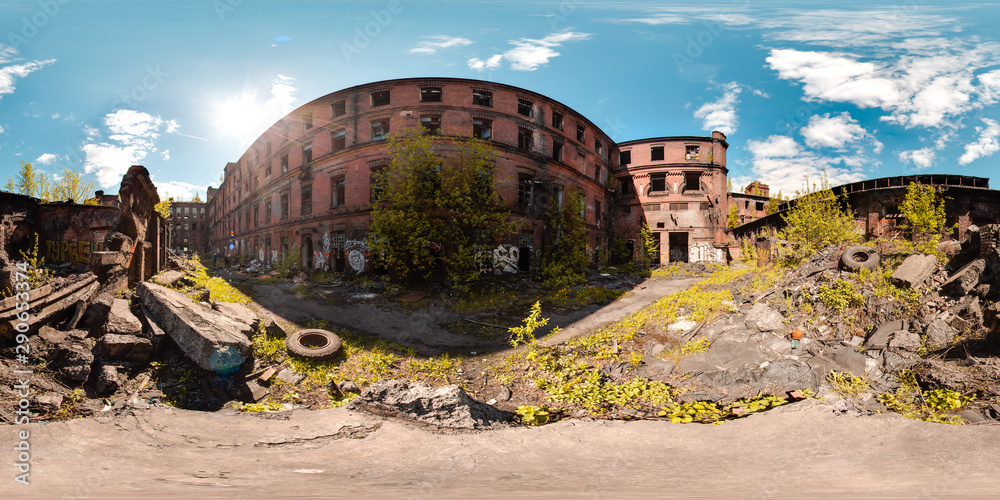 3D spherical panorama with 360 viewing angle ready for virtual reality or VR. Full equirectangular projection. ghost town. Exterior of abandoned industrial building landscape architecture of the city