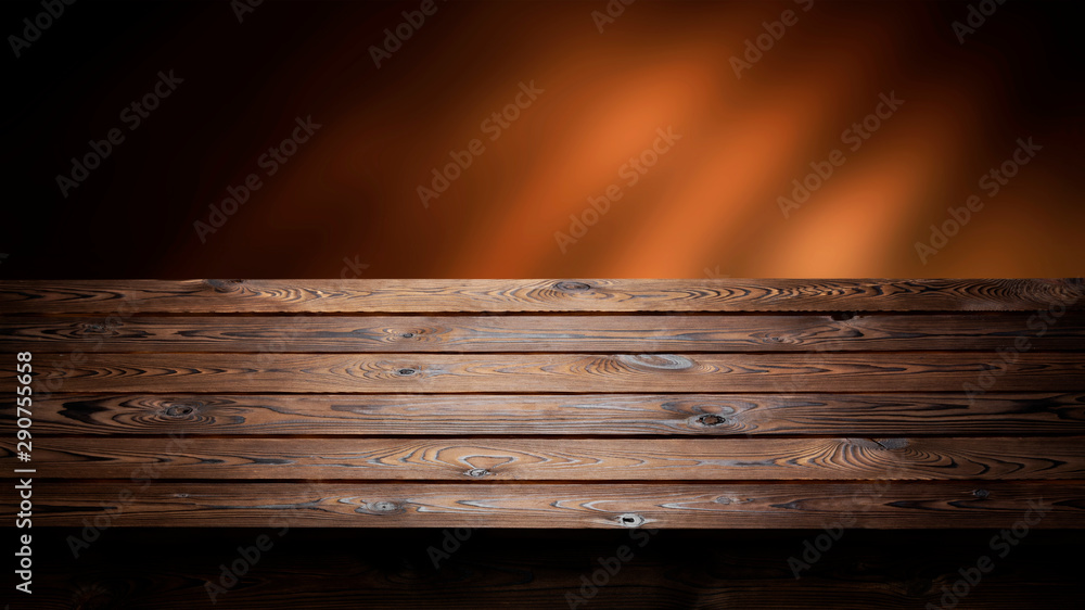 Dark wooden background, table for product, old wooden perspective interior