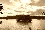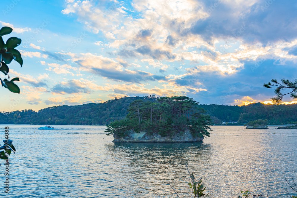 Matsushima Bay in dusk, beautiful islands covered with pine trees and rocks. One of the Three Views of Japan, and is also the site of the Zuigan-ji, Entsu-in and Kanrantei. in Miyagi Prefecture, Japan