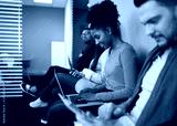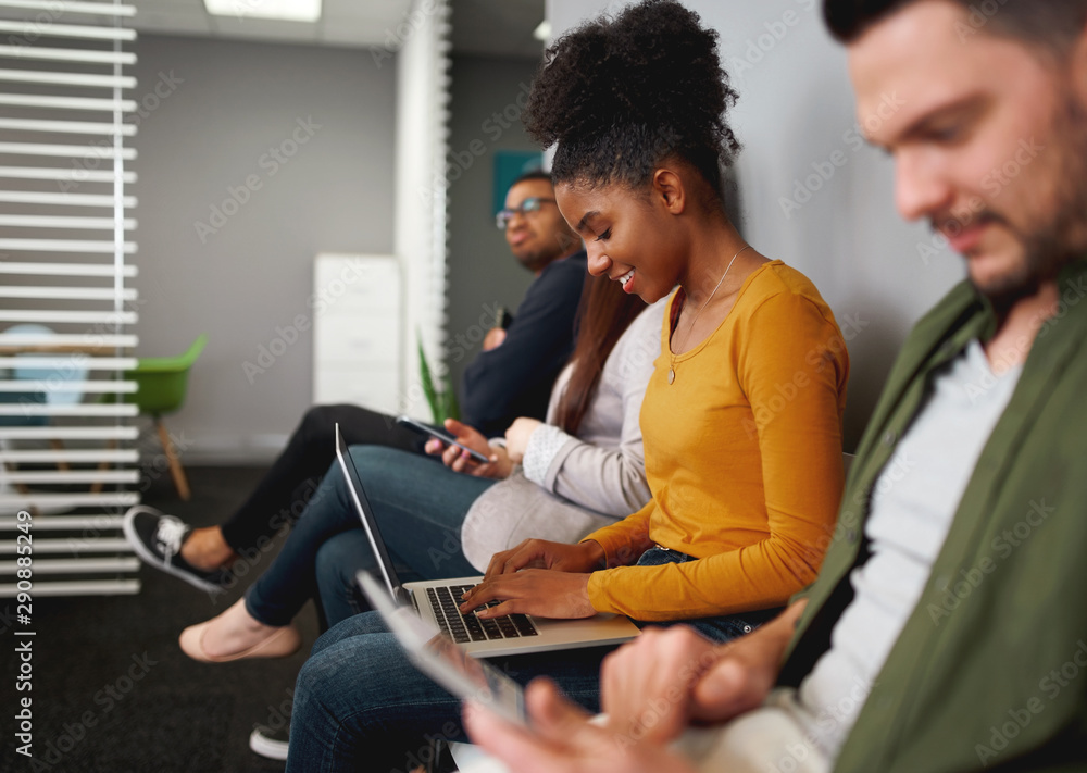 Concentrated smiling young african american woman sitting in queue preparing for job talk hiring in office