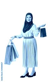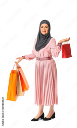 Beautiful mature Muslim woman with shopping bags on white background