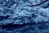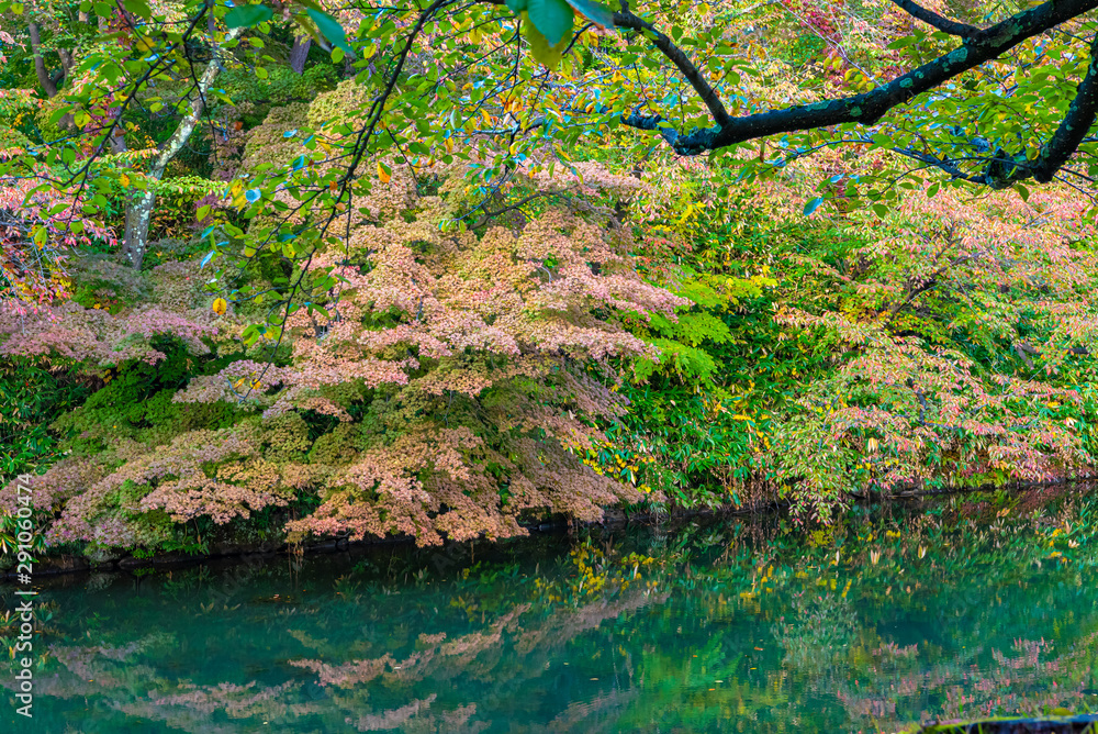 Hirosaki Castle Park Autumn foliage scenery view. Beautiful landscapes of multicolor reflecting on surface in sunny day. Hirosaki city, Aomori Prefecture, Japan
