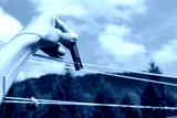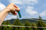 Hand holding a clothespin hanging it on an empty wire, green eco forest natural outdoor scenery, cloudy sky. Attaching a single plastic clothes peg, clamp, doing laundry concept, horizontal wires