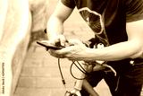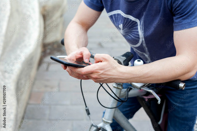 A young man holding a smartphone sitting on a bike resting his hands on the handlebars. Biker / cyclist using his mobile phone on his bike, texting, checking his phone and social media during a trip