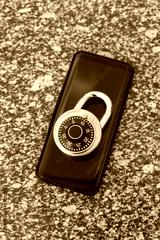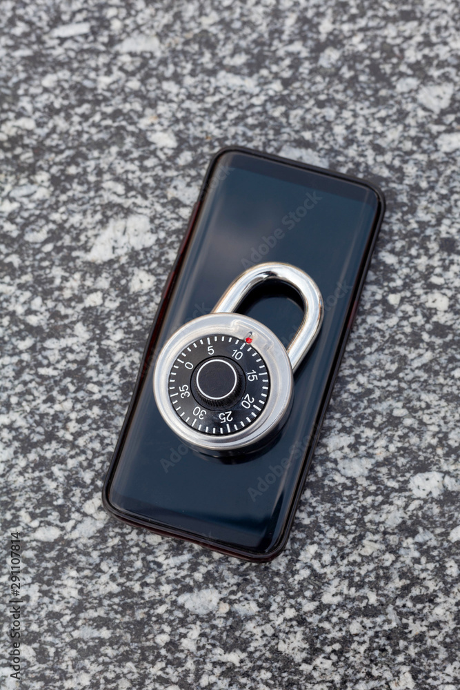 no name smartphone and a shiny round simple combination padlock laying on top of it, number code lock as a mobile device security symbol concept on a granite background, copyspace