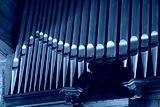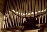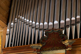 Pipe organ in a wooden church frontal shot, row of many shiny prospect pipes visible from below, closeup. Liturgical music service, concert advertisement, organ musical instrument background concept