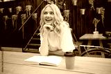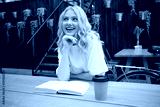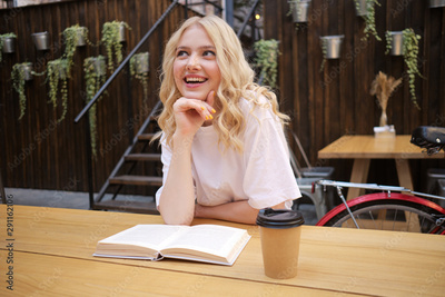 Beautiful smiling blond girl happily dreaming while sitting with book and coffee in courtyard of cafe
