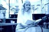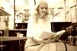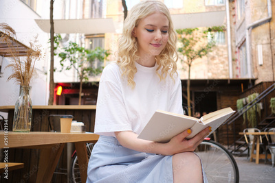 Beautiful romantic blond girl dreamily reading book in courtyard of city cafe