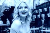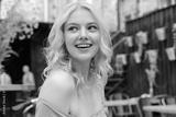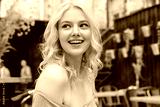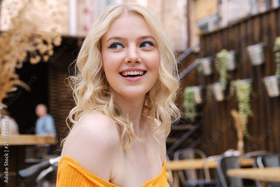 Portrait of beautiful blond girl joyfully looking away while resting in courtyard of cafe