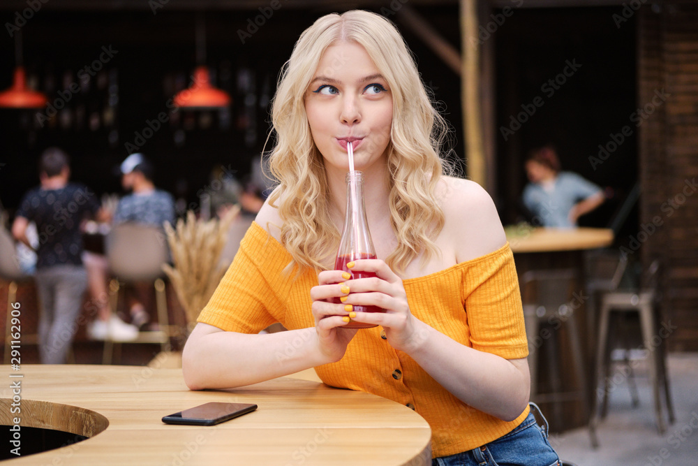 Portrait of beautiful blond girl dreamily drinking lemonade in courtyard of city cafe