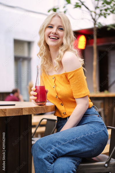 Pretty joyful blond girl happily looking in camera with lemonade while resting in courtyard of cafe
