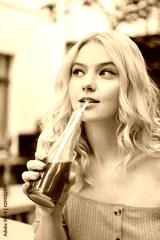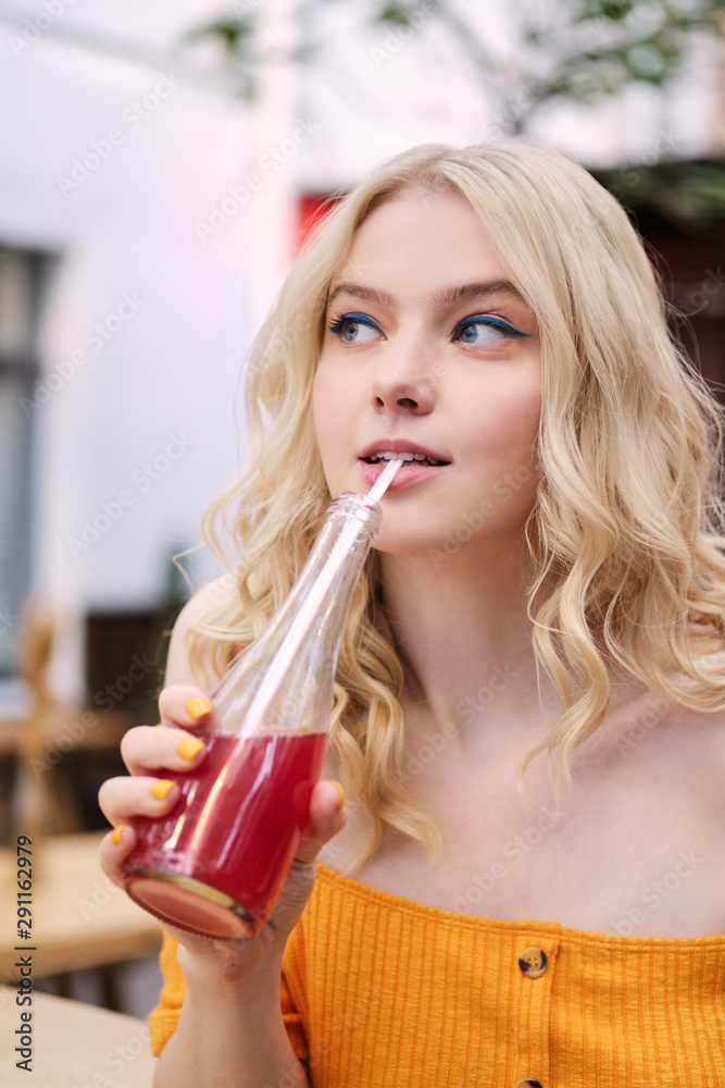 Portrait of beautiful dreamy blond girl thoughtfully looking away while drinking lemonade in courtyard of cafe