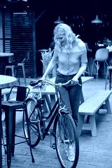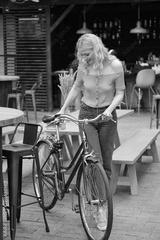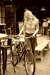 Beautiful smiling blond girl standing with classic red bicycle in courtyard of city cafe