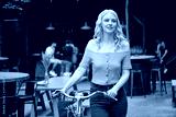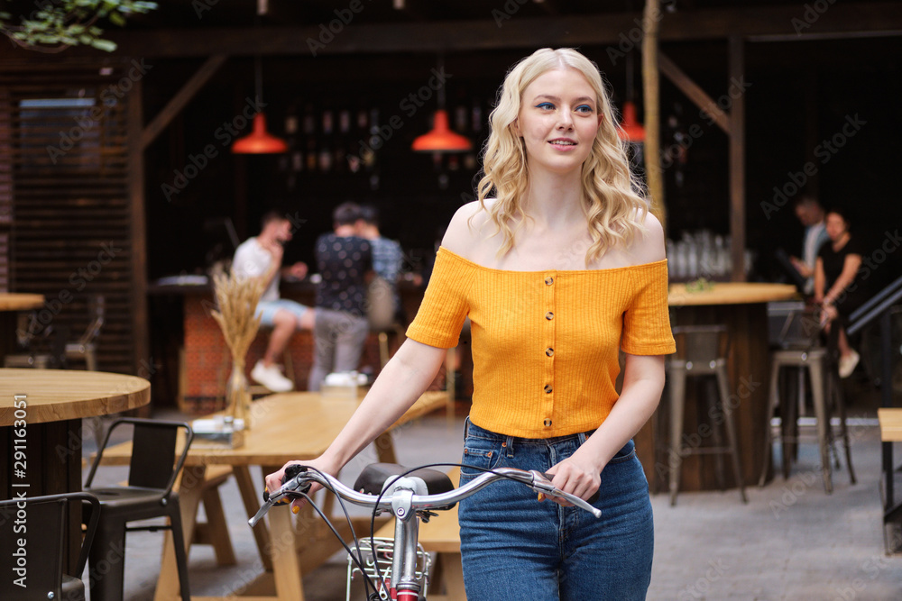 Attractive casual blond girl standing with classic bicycle in courtyard of city cafe