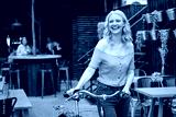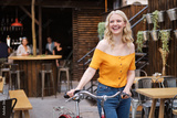 Beautiful cheerful blond girl standing with classic bicycle while happily resting in courtyard of cafe