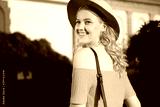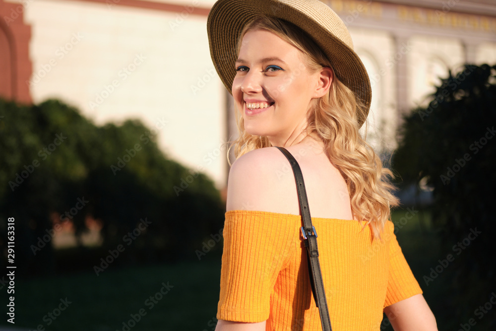 Portrait of beautiful romantic blond girl in hat joyfully looking away on street
