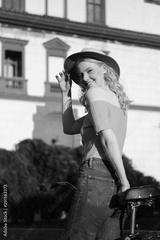 Gorgeous smiling blond girl in hat standing with bicycle while happily looking in camera on city street