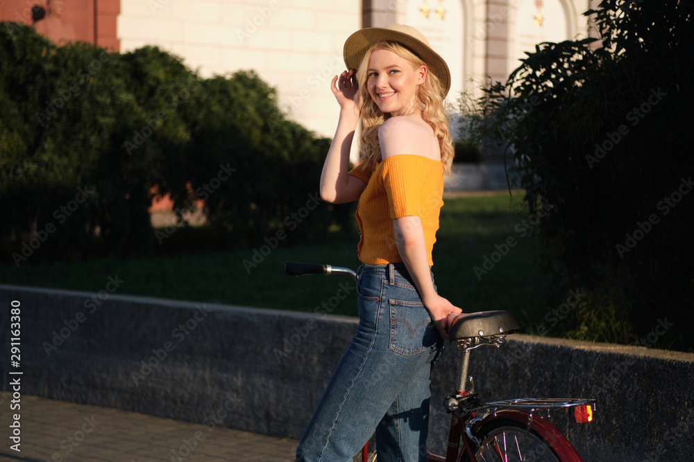 Beautiful romantic blond girl in hat standing with bicycle while joyfully looking in camera on city street