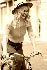 Attractive cheerful blond girl in hat joyfully riding on classic bicycle through street