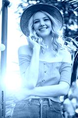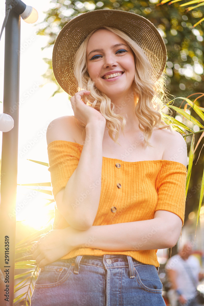 Portrait of attractive smiling blond girl in hat happily looking in camera over sunset on street
