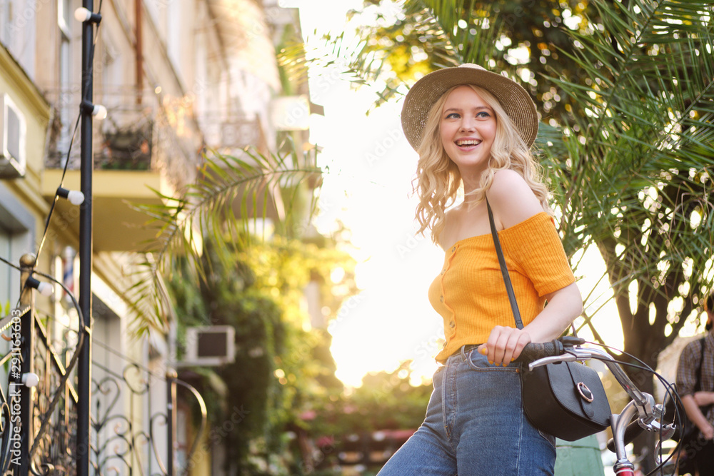 Pretty cheerful blond girl in hat happily looking away over sunset on street