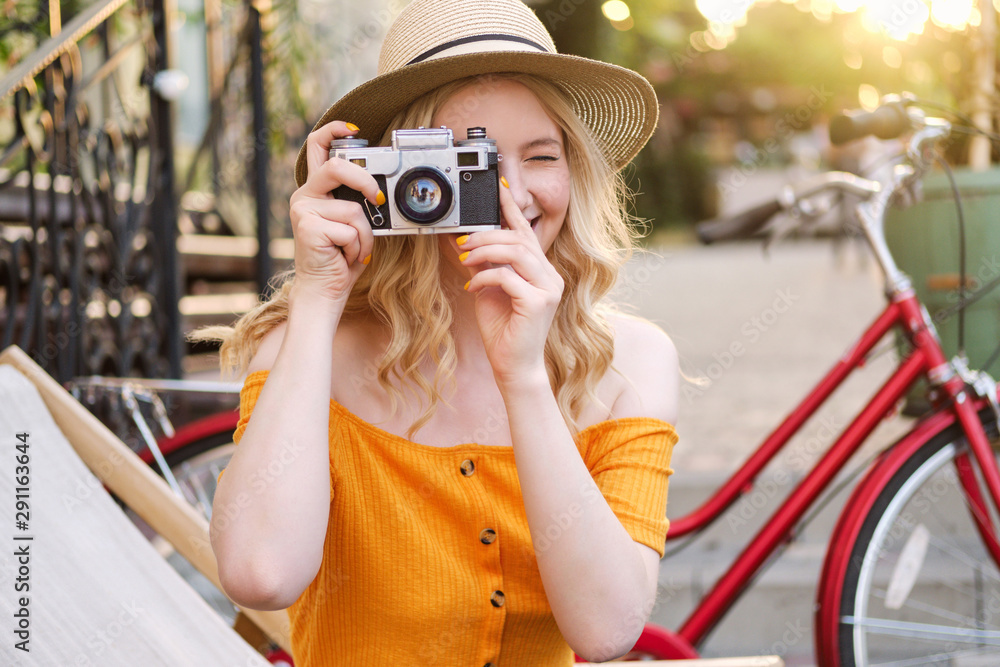 Beautiful smiling blond girl in hat happily taking photo on retro camera on deck chair in cafe