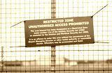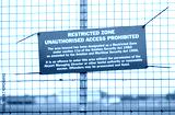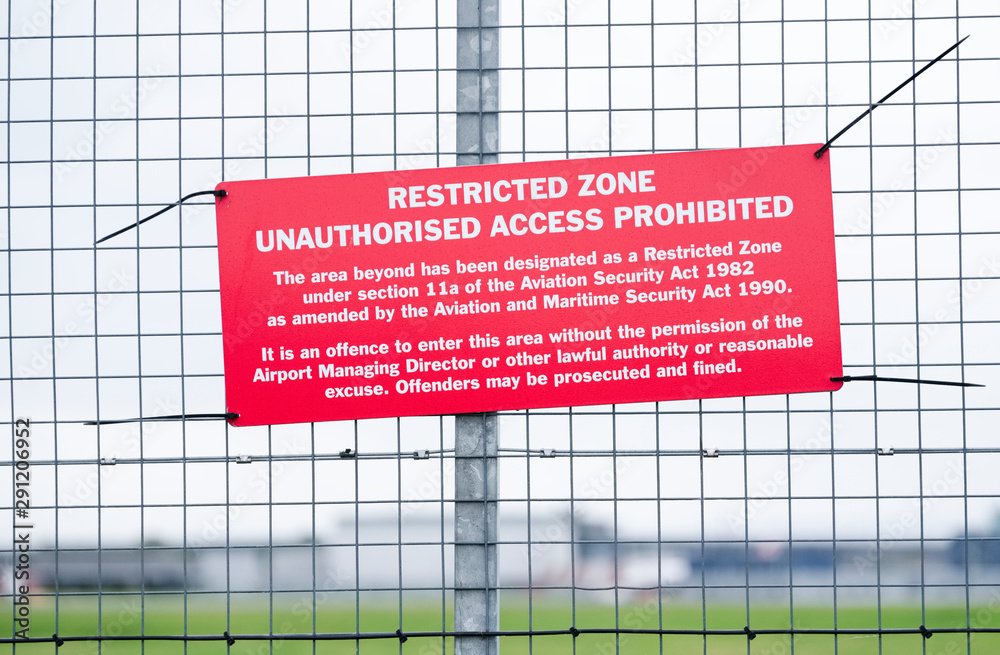 Restricted air space zone sign at airport barrier fence no unauthorised access