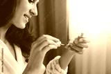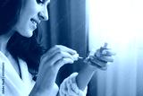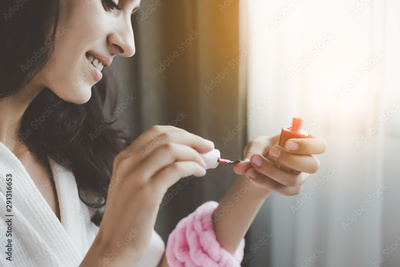Beautiful woman use red color nail polish for painting her beautiful manicure in the morning at home with smiley face. Charming beautiful woman love to painted her nails by herself, She feel happy