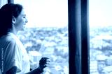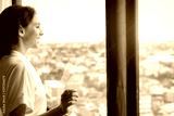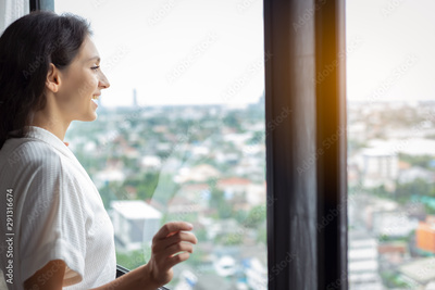 Beautiful woman look at nice view of cityscape at condominium room or hotel of hig building. Gorgeous woman wear bathrobe. Pretty girl get fresh, happiness with smiley face. Glamour lady feel relaxing
