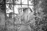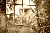 Back view of beautiful romantic girl in pink dress dreamily tying hair looking in reflection on window in old garden