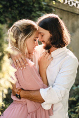 Portrait of young beautiful romantic couple sensually hugging each other on date