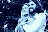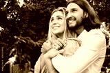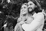 Young beautiful romantic couple hugging each other while happily looking away on date outdoor