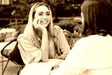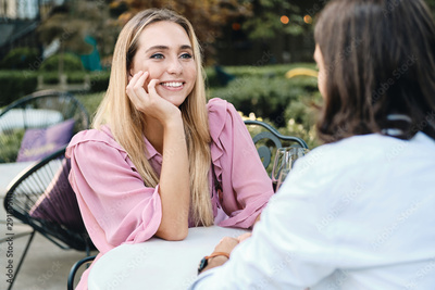 Young pretty smiling woman in dress joyfully looking at boyfriend on date in cafe outdoor