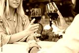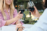 Close up photo of romantic couple with glasses of wine on date in cafe outdoor