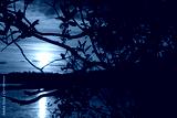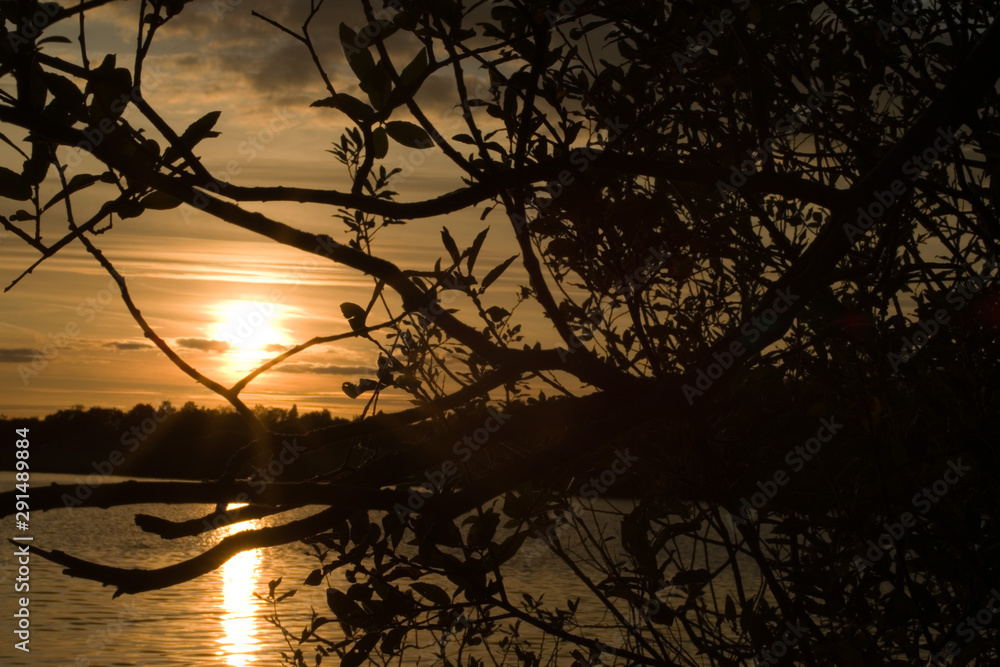 Sun setting on rippling lake against blue and gold cloudscape through tree brances