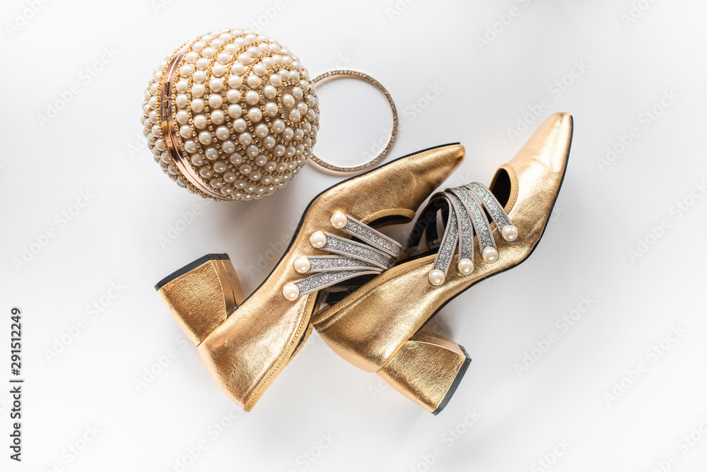 close-up of gold shoes and a gold clutch with pearls on a white background