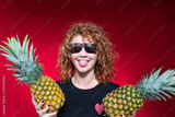 Red-haired beaut in a black t-shirt with a print of heart hold a pineapple in her hands on a red background. Happy girl. Amazing emotions. Sweet pineapple.