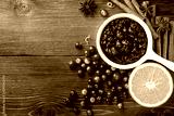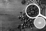 Cranberry sauce in ceramic saucepan with ingredients for cooking on kitchen wooden table top view.