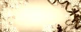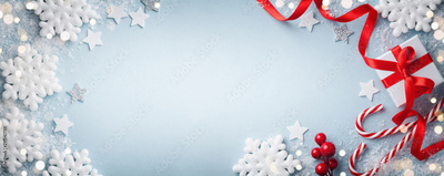 Christmas blue background. Gift or present box, white snowflakes and holiday decoration top view. Happy New Year card. Banner format.