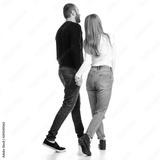 Young couple woman and man walking goes looking on white background isolation, rear view