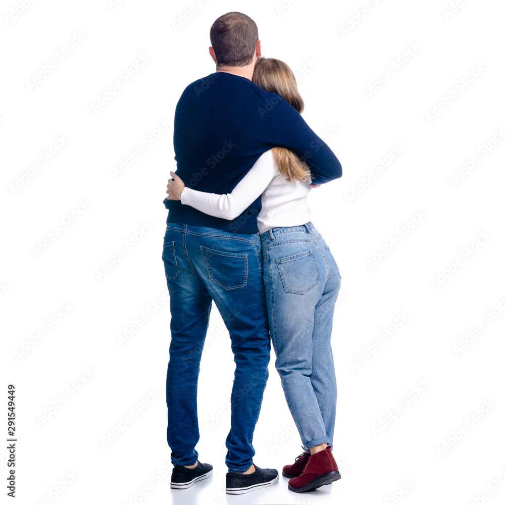 Young couple woman and man hug embrace relationships on white background isolation, rear view