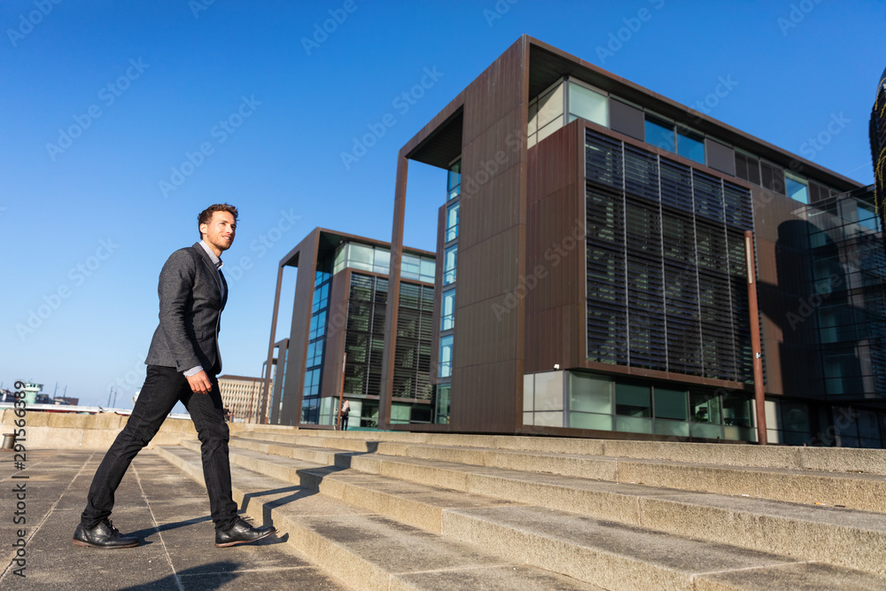 Young businessman walking to work on morning commute going to office on Copenhagen city street urban people commute lifestyle. Happy business man wearing suit in fall or spring.
