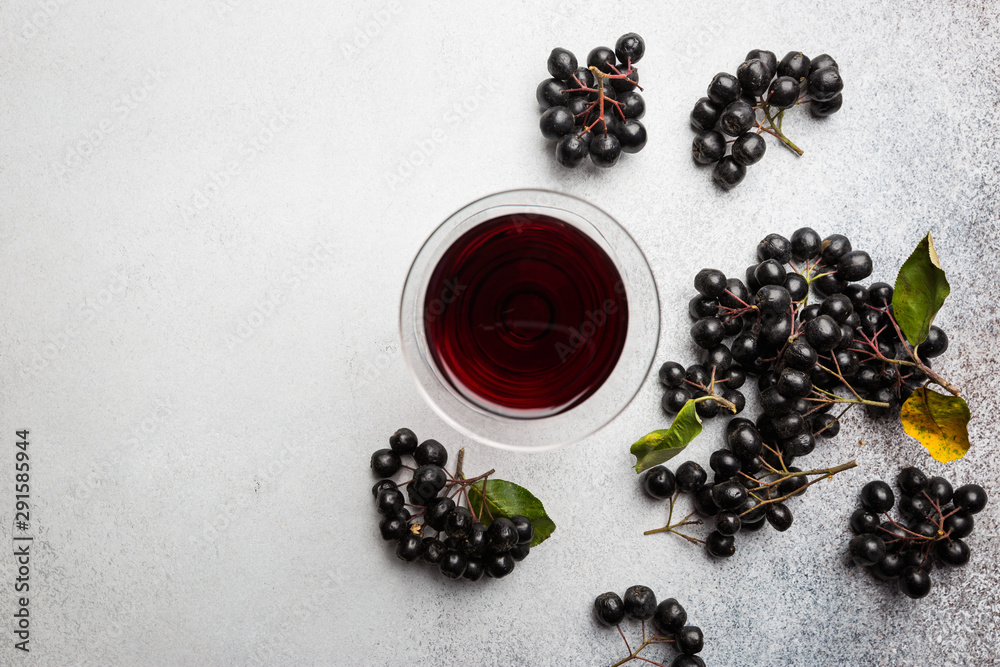 homemade black chokeberry wine or liqueur with ripe berries, top view