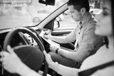 Male auto instructor takes exam in young woman. Model driving car. Hold hands on steering wheel. Male instructor write on paper. Road trip.