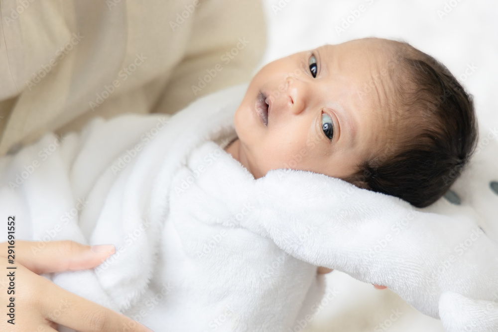 Young Asian mother hugging a cute newborn baby looking in white bedroom. Duty of the wife to raise children. Mother and child concept.