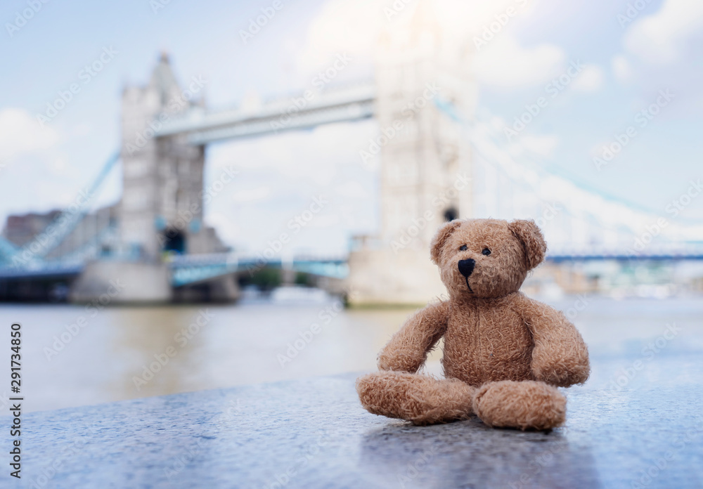 Teddy bear sitting alone with blurry london tower bridge background, The forgotten bear sitting by the river, lost property, Lonely concept, Lost child, International missing child