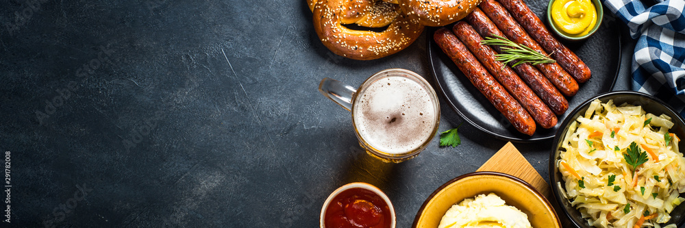 Oktoberfest food - sausage, beer and bretzel.