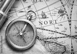antique compass and spyglass on ancient map by H. Hondius dated 1630AD